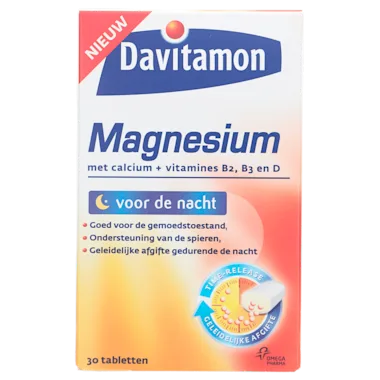 Per dagdosering van 1 tablet:#vitamine B2;1,4;mg;100%#vitamine B3;16;mg;100%#vitamine D3;5;µg;100%#magnesium;400;mg;107%#calcium;120;mg;15%#