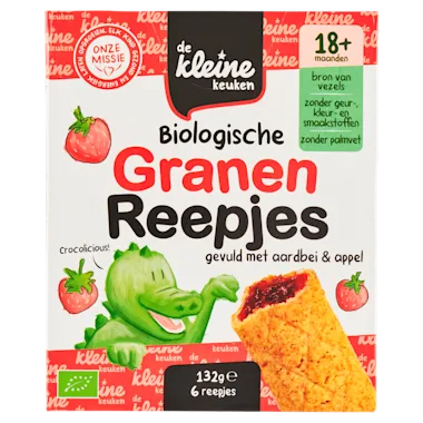 Ingrediënten: Volkoren TARWEmeel 39%, fruitvulling 25% (geconcentreerd appelsap*, aardbeipuree* 27%, appelpuree* 8%, geleermiddel: pectine), geconcentreerd appelsap*, rijstmeel*, zonnebloemolie*, kokosolie*, rijsmiddel (natriumbicarbonaat), emulgator (zonnebloemlecithine)*, vitamine B1, * van biologische oorsprong Kan sporen bevatten van eieren, soja en mosterd.