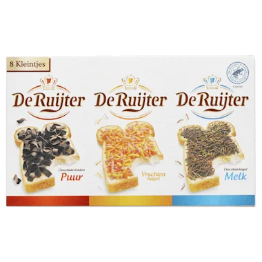 Kan jij ook nooit kiezen wat je op je brood smeert? Dat is niet meer nodig met De Ruijter Kleintjes Strooibaar! De verschillende toppings (hagelslag en vlokken) van De Ruijter Kleintjes Strooibaar zorgen voor een unieke beleving op elk sneetje brood. Je kan De Ruijter Kleintjes Strooibaar gebruiken om havermout, yoghurt, ontbijtgranen, broodbeleg en baksels nog lekkerder te maken! Elke topping is gemaakt met rijke ingrediënten. Verras jouw smaakpapillen met verschillende smaken en vormen in elk sneetje brood. Maak van elk sneetje een unieke ervaring! De Ruijter. Sinds voor altijd.