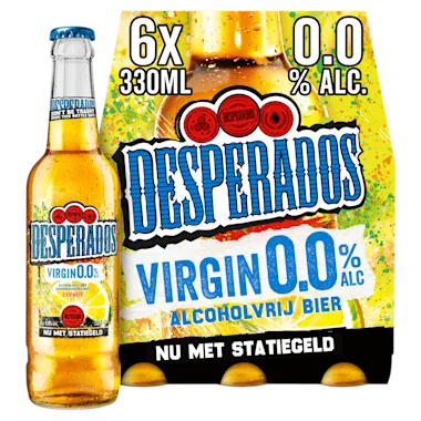 Desperados Virgin 0.0% Desperados Virgin 0.0% is een uniek alcoholvrij bier met een geweldige smaak die gegarandeerd voor een vefrissende kick zorgt. Je proeft de ultieme verfrissing van citrus en de pit waar Desperados om bekend staat. Wat de gelegenheid ook is, Desperados Virgin 0.0% brengt altijd goede vibes en gezelligheid. Desperados virgin 0.0%: 100% taste, 0% alcohol.
