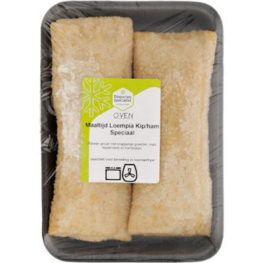 Loempia met groenten, kippenvlees en ham, voorgefrituurd, diepvries.