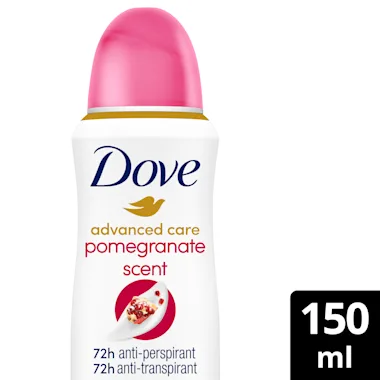 Dove Advanced Care Go Fresh Pomegranate & Lemon Verbena Anti-Transpirant Deodorant Spray verzorgt en hydrateert de okselhuid. Deze deodorant spray heeft een frisse en pittige geur van granaatappel en citroenverbena. De Dove Advanced Care anti-transpiranten maken deel uit van de meest verzorgende lijn van Dove, met de verbeterde gepatenteerde formule zijn ze zacht voor de huid, zelfs na het scheren. Het Advanced Care assortiment van Dove biedt met de Triple Moisturising technologie tot 72 uur bescherming tegen zweet.