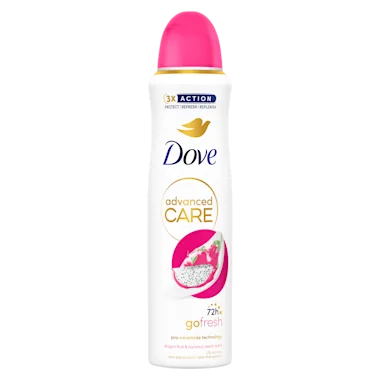 Dove Advanced Care Go Fresh Dragon Fruit & Coconut Cream Anti-Transpirant Deodorant Spray met een frisse, zoete geur beschermt tegen zweet én is lief voor je oksels. Het Advanced Care assortiment van Dove met de verbeterde formule met Pro-Ceramide serum maakt deel uit van de meest verzorgende lijn van Dove. De spray biedt onmiddellijke verlichting na het scheren, helpt de okselhuid te herstellen en beschermt tot 72 uur tegen zweet en lichaamsgeur. Bovendien bevat deze milde formule 0% alcohol. De hele dag een fris en verzorgd gevoel – wat de dag je ook brengt!