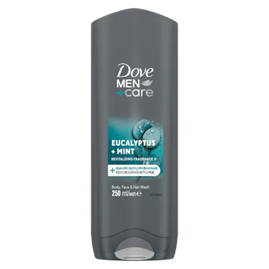 Knijp eerst wat van de Dove Men+Care Eucalyptus + Mint 3-in-1 Douchegel in je handpalm. Wrijf dit vervolgens in je handen om het te laten schuimen en de MicroMoisture technologie te activeren. Breng aan op gezicht, lichaam en haar, spoel daarna af. Goed om te weten: deze douchegel laat na het afspoelen geen resten achter. Combineer deze 3-in-1 Body, Face & Hair Wash met de andere producten uit dit assortiment, voor een verfrissende en huidversterkende verzorgingsroutine voor mannen.