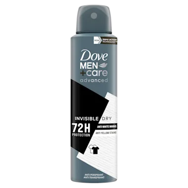 Dove Men+Care Advanced Invisible Dry Anti-Transpirant Deodorant Spray met anti-bacteriële geurbestrijding beschermt tot 72 uur lang tegen zweet en nare geurtjes en heeft een langdurig frisse geur. De milde formule van Dove Men+Care, met 1/4 hydraterende crème die je okselhuid verzorgt, geeft je de bescherming die je nodig hebt en is ontworpen om gele vlekken en witte strepen op je kleding te voorkomen. Want het dragen van je favoriete kleding kan je het zelfvertrouwen geven om elke dag aan te kunnen. Dove Men+Care Advanced Invisible Dry Anti-Transpirant Deodorant Spray helpt je om je op je best te voelen.