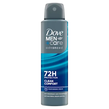 Dove Men+Care Advanced Clean Comfort Anti-Transpirant Deodorant Spray met anti-bacteriële geurbestrijding beschermt tot 72 uur lang tegen zweet en nare geurtjes, heeft een langdurig frisse geur en verzorgt je oksels. Met een frisse, mannelijke geur voel jij je langdurig fris en zelfverzekerd. Deze Dove Men+Care anti-transpirant met 1/4 hydraterende crème verzorgt de okselhuid, zo behoren irritaties door zweet en scheren tot het verleden. Je krijgt een gehydrateerde en beschermde huid en gladde, comfortabel aanvoelende oksels.