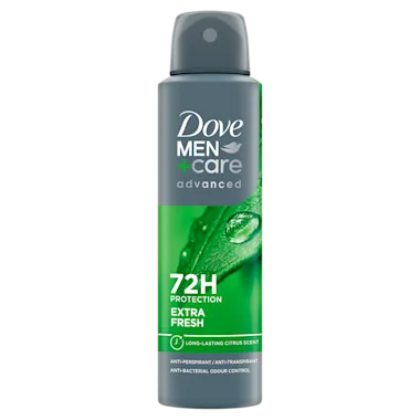 Dove Men+Care Advanced Extra Fresh Anti-Transpirant Deodorant Spray met anti-bacteriële geurbestrijding beschermt tot 72 uur lang tegen zweet en nare geurtjes en verzorgt je oksels. Met de frisse citrusgeur voel jij je langdurig fris en zelfverzekerd. Deze Dove Men+Care anti-transpirant met 1/4 hydraterende crème verzorgt de okselhuid, zo behoren irritaties door zweet en scheren tot het verleden. Je krijgt een gehydrateerde en beschermde huid en gladde, comfortabel aanvoelende oksels.