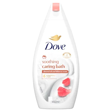Dove Soothing Caring Bath Amandelolie & Hibiscus Badcrème is de perfecte manier om jezelf thuis te verwennen en een zachte, schone en soepele huid te krijgen. Het rijke badschuim vult je bad met een zachte en ontspannende geur. De formule is verrijkt met 1/4 hydraterende crème en zorgt voor een zachte, gladde en stralende huid.