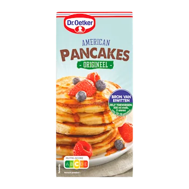 Benodigdheden 1 pak Dr. Oetker American Pancakes Origineel, 300 ml melk, 2 eieren (M), zonnebloemolie. Keukengerei: Mixer met gardes, Saus- of ijslepel, Koekenpan. Bereidingstijd circa 20 minuten. Bereidingswijze: 1. Doe de mix in een beslagkom en voeg 300 ml melk en 2 eieren toe. 2. Mix het geheel met een mixer met gardes op de laagste stand door elkaar. 3. Klop het beslag daarna 2 minuten op de hoogste stand tot een stevig, luchtig beslag. 4. Verhit een scheutje olie in de koekenpan. 5. Schep met de saus- of ijslepel het beslag in de koekenpan en vorm het met de achterkant van de lepel tot een ronde pancake van ca. 10 cm doorsnee. 6. Bak de pancake op een matig vuur aan beide zijden goudbruin (1 minuut per zijde).