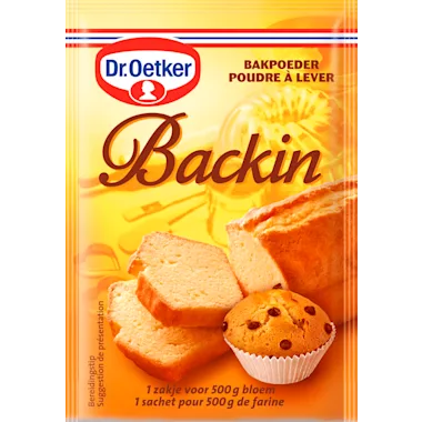 Meer dan honderd jaar geleden begon Dr. August Oetker met het verkopen van zakjes Backin bakpoeder: het geheim voor luchtig gebak. Voeg een zakje Backin toe aan 500 gram bloem en je maakt zelf de luchtigste cake en pannenkoeken. Zeef de bloem, meng het Backin bakpoeder en voeg de overige ingrediënten toe volgens het recept.