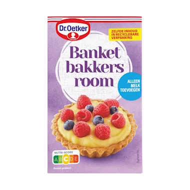 Benodigdheden: 1 zakje Dr. Oetker Banketbakkersroom • 500 ml koude (halfvolle) melk • Mixer met gardes • Beslagkom Bereidingswijze: 1. Giet 500 ml koude melk en de Mix voor Banketbakkersroom in een kom en meng het geheel met een garde of mixer op de middelste stand. 2. Klop het geheel één minuut op de hoogste stand tot een glad mengsel. 3. Laat de banketbakkersroom ca. 5 minuten opstijven in de koelkast en top of vul jouw baksel met de room.