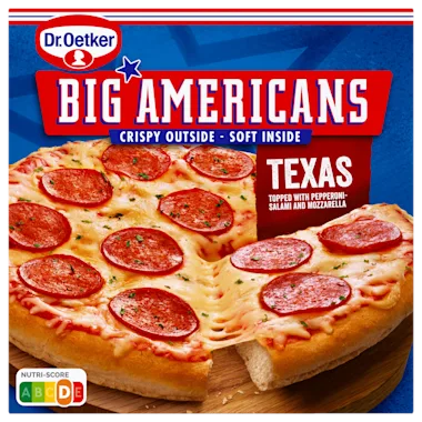 Met de Big americans pizza texas haal je een smaakvolle diepvriespizza in huis. De dikke Amerikaanse bodem is heerlijk luchtig en krokant, en vormt de perfecte basis voor de kruidige pepperoni-salami en gesmolten mozzarella. Deze pizza is een echte traktatie voor iedereen die houdt van grootse smaken. Ideaal voor een snelle maaltijd of een gezellige avond vol comfortfood. Proef de volle smaken van Texas bij elke hap en geniet van The Real Big Taste!