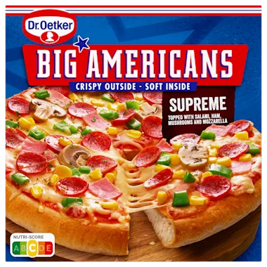 Met deze diepvriespizza haal je een echte smaakexplosie in huis. De Big americans pizza supreme is perfect voor liefhebbers van rijkelijk belegde pizza’s. De combinatie van salami, ham, groenten en romige kaas zorgt voor een heerlijke maaltijd die in een mum van tijd op tafel staat. Dankzij de dikke Amerikaanse bodem geniet je van een luchtige bite met een krokante finish. Ideaal voor een gezellige avond met vrienden of een snelle hap na een lange dag. Geniet van The Real Big Taste!