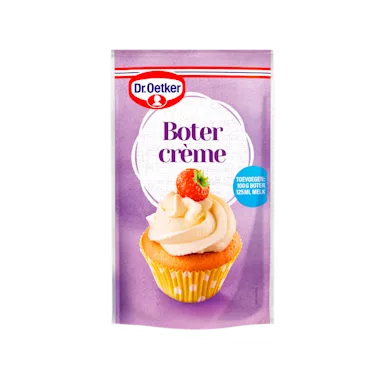 Benodigdheden - 1 zakje Dr. Oetker Botercrème - 100 g zachte boter - 125 ml koude melk - Mixer met gardes - Beslagkom Bereidingswijze 1. Klop de zachte boter op de laagste stand met de mixer met gardes in 1 minuut glad, smeuïg en zonder klontjes. 2. Voeg de koude melk en de botercrèmemix toe. 3. Mix het geheel ca. ½ minuut met de mixer met gardes op de laagste stand door elkaar. 4. Ga met een lepel over de bodem en de randen van de kom, zodat alle boter goed loskomt en door de crème gemengd kan worden. 5. Klop de massa in ca. 1 minuut op de hoogste stand tot een luchtige botercrème.