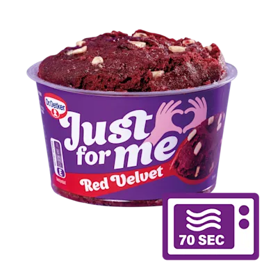 BEREIDING 1. Verwijder seal van de bovenzijde. 2. Voeg 30 ml water (ca. 3 eetlepels) op kamertemperatuur toe aan de Red Velvetmix in het cupje en roer goed door tot een egale massa. 3. Bereid de Red Velvet in ca. 70 seconden op 900 watt in de magnetron. 4. Geniet van jouw heerlijke warme smeuïge Red Velvet!