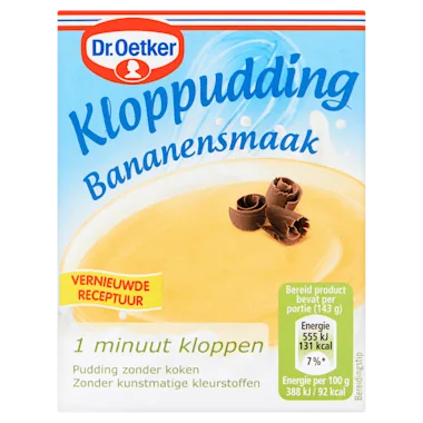 Kloppudding is een bijzonder zelfmaak toetje met de zoete smaak van banaan. Deze pudding maak je zonder te koken en staat binnen een paar minuten op tafel. Heb je zin in een lekker toetje dat ook nog eens snel klaar is? Dan is de Dr. Oetker kloppudding banaan precies wat je zoekt. Naast een toetje kun je deze bananenpudding ook gebruiken als vulling voor cupcakes en taarten. Spatel de pudding na het kloppen in een spuitzak en decoreer jouw baksels met verschillende spuittechnieken.