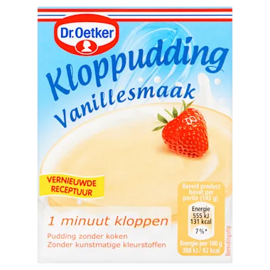 Kloppudding is een bijzonder zelfmaak toetje met de subtiele smaak van vanille. Deze pudding maak je zonder te koken en staat binnen een paar minuten op tafel. Heb je zin in een lekker toetje dat ook nog eens snel klaar is? Dan is de Dr. Oetker kloppudding vanille precies wat je nodig hebt. Naast een toetje kun je deze vanillepudding ook gebruiken als vulling voor cupcakes en taarten. Spatel de pudding na het kloppen in een spuitzak en decoreer jouw baksels met verschillende spuittechnieken.