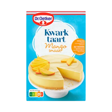 Benodigdheden: - 1 pak Dr. Oetker Kwarktaart Mangosmaak - 500 g magere kwark - 250 ml slagroom - 60 g boter/margarine - 300 ml water Keukengerei - Springvorm Ø 24 cm - Mixer met gardes - Beslagkom - Steelpannetje Bereidingstijd - Bereiding: +/- 15 minuten - Opstijftijd: ten minste 2,5 uur VOORBEREIDEN (5 MINUTEN): - Leg het bijgesloten velletje bakpapier over de springvormbodem. Plaats de rand hierop en sluit de springvorm. - Smelt 60 gram boter in een pannetje. - Neem het pannetje van het vuur en roer de inhoud van het zakje kruimelbodemmix door de gesmolten boter. - Bedek de bodem van de springvorm gelijkmatig met de massa en druk dit stevig aan met de bolle kant van een lepel. TAART BEREIDEN (5 MINUTEN): - Doe 300 ml water (handwarm, +/- 30°C), de kwark en de slagroom in een kom en meng dit met een mixer met gardes op de laagste stand door elkaar. Gebruik voor het beste resultaat de kwark en de slagroom direct vanuit de koelkast. - Voeg de taartmix toe en meng het mengsel met de mixer op de laagste stand in 1 minuut tot een glad mengsel. Klop het daarna op de hoogste stand in 2½ minuut tot een luchtige massa. - Schenk het taartmengsel over de bodem. - Laat de taart ten minste 2½ uur opstijven in de koelkast. VERSIEREN (5 MINUTEN): - Versier eventueel met verse stukjes mango.