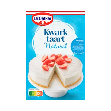 BENODIGDHEDEN: · 1 pak Dr. Oetker Kwarktaart Naturel · 500 g magere kwark · 250 ml slagroom · 60 g boter/ margarine · 300 ml water. KEUKENGEREI: Springvorm ?24 cm, Mixer met gardes, Beslagkom, Steelpannetje. BEREIDINGSTIJD: BEREIDING: ± 15 MINUTEN. OPSTIJFTIJD: TEN MINSTE 2,5 UUR. VOORBEREIDEN (5 MINUTEN): Leg het bijgesloten velletje bakpapier over de springvormbodem. Plaats de rand hierop en sluit de springvorm. Smelt de 60 g boter in een pannetje. Neem het pannetje van het vuur en roer de inhoud van het zakje kruimelbodemmix door de gesmolten boter. Bedek de bodem van de springvorm gelijkmatig met de massa en druk dit stevig aan met de bolle kant van een lepel. TAART BEREIDEN (5 MINUTEN): Doe 300 ml water (handwarm, + 30°C), de kwark en de slagroom in een kom en meng dit met een mixer met gardes op de laagste stand door elkaar. Gebruik voor het beste resultaat de kwark en slagroom direct vanuit de koelkast. Voeg de taartmix toe en meng het mengsel met de mixer op de laagste stand in 1 minuut tot een glad mengsel. Klop het daarna op de hoogste stand in 2½ minuut tot een luchtige massa. Schenk het taartmengsel over de bodem. Laat de taart ten minste 2½ uur opstijven in de koelkast. VERSIEREN (5 MINUTEN): Versier eventueel met vers fruit, zoals frambozen en blauwe bessen.