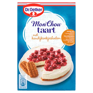 Ingrediënten: - 1 pak Dr. Oetker MonChou taart met kandijkoekjesbodem - 200 g MonChou (2 pakjes) - 250 ml slagroom - 70 g boter of margarine - 100 ml water - Evt. vlaaifruit Extra nodig: - Springvorm 24 cm - Mixer met gardes - Beslagkom - Steelpannetje Bereidingswijze: Taartbodem bereiden (5 minuten) - Leg het bijgesloten velletje bakpapier over de springvormbodem. Plaats de rand hierop en sluit de springvorm. - Smelt 70 gram boter in een pannetje. - Roer de inhoud van het zakje kruimelbodemmix door de gesmolten boter. - Bedek de bodem van de springvorm gelijkmatig met de massa en druk dit stevig aan met de bolle kant van een lepel. - Zet de vorm ca. 10 minuten in de koelkast. Taart bereiden (5 minuten) - Klop in een kom de MonChou (200g op kamertemperatuur) met een mixer met gardes op de hoogste stand in 1 minuut glad. - Voeg het water (100 ml op kamertemperatuur) en de taartmix aan de monchou toe en klop dit op de middelste stand tot een egale massa. - Voeg de ongeklopte slagroom toe aan het taartmengsel en klop dit met de mixer op de middelste stand in 11/2 minuut tot een luchtige massa. - Verdeel het taartmengsel over de bodem en laat de taart ten minste 2 uur opstijven in de koelkast. Versieren (5 minuten) - Garneer de MonChoutaart vlak voor serveren bijvoorbeeld met een vlaaifruit of verse vruchten naar keuze.