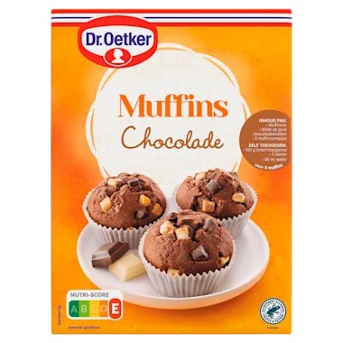 Benodigdheden: 1 pak Dr. Oetker Muffins Chocolade, 100 g boter/ margarine, 2 eieren, 60 ml water. Keukengerei: Mixer met gardes, Beslagkom, Evt. een muffinbakblik*, 2 eetlepels of ijslepel. Bereidingstijd: Bereiding: ±12 minuten, Baktijd: ±19 minuten Oventemperatuur: Elektrische oven: 190°C. Hetelucht oven: 175°C. Gas oven: stand 4. Elektrische oven aanbevolen. Voorbereiden (5 minuten): Zorg dat de eieren op kamertemperatuur zijn en de boter zacht is. Plaats de muffinvormpjes in een muffinbakblik of direct op de bakplaat. Verwarm de oven voor. Voor het beste resultaat bak je de muffins in een elektrische oven. Beslag bereiden (7 minuten): Doe de boter in een beslagkom en mix het met een mixer met gardes zacht en romig. Voeg de muffinmix, de eieren en het water toe en mix het geheel in een halve minuut op de middelste stand tot een glad beslag (niet luchtig kloppen). Voeg de chocoladestukken toe (houd ¼ achter voor decoratie) en lepel door het beslag. Verdeel het beslag met twee eetlepels of een ijslepel over de muffinvormpjes. Verdeel de achtergehouden chocoladestukken over de muffins. Zorg ervoor dat er geen chocoladestukken op de bakplaat vallen, dit gaat verbranden. Bakken (ca. 19 minuten): Plaats de bakplaat in het midden van de voorverwarde oven en bak de muffins in ca. 19 minuten gaar. De muffins zijn gaar als je met je vinger licht op de muffin drukt en deze terugveert (let op: de chocoladestukken zijn heet).