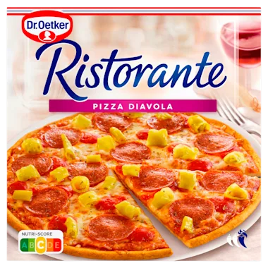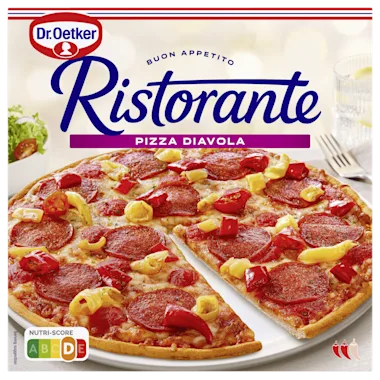 Samen met de dunne, krokante bodem van de Ristorante pizza diavola krijg je de perfecte balans van pittige smaken en heerlijke kaas. Deze pizza is ideaal voor een avondje met vrienden op de bank, een romantisch diner, of wanneer je zin hebt in een snelle, maar smaakvolle maaltijd.