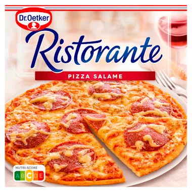 Ingrediënten: TARWEBLOEM, 14% gezeefde tomaten, 12% MOZZARELLA KAAS, 12% salami (varkensvlees, spek, zout, specerijen, dextrose, uienpoeder, knoflookpoeder, specerijenextracten, stabilisator (natriumnitriet), antioxidant (extract van rozemarijn), rook), water, 7,3% tomatenconcentraat, 4,6% EDAMMER KAAS, raapzaadolie, bakkersgist, zout, suiker, olijfolie extra vierge, oregano, basilicum, peper, paprika, peterselie. Kan bevatten: SOJA, MOSTERD.