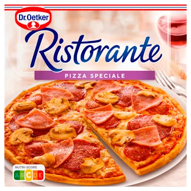 Ingrediënten: TARWEBLOEM, 15% KAAS (MOZZARELLA, EDAMMER), 12% gezeefde tomaten, water, 6,4% salami (varkensvlees, spek, zout, specerijen, dextrose, uienpoeder, knoflookpoeder, specerijenextracten, stabilisator (natriumnitriet), antioxidant (extract van rozemarijn), rook), 6,2% tomatenconcentraat, 5,6% gekookte achterham (varkensvlees, water, zout, dextrose, stabilisatoren (difosfaten, trifosfaten, natriumnitriet), antioxidant (natriumascorbaat), specerijenextract, rookaroma), 5,6% champignons, raapzaadolie, 3,3% pepperonisalami (varkensvlees, spek, zout, specerijen, dextrose, uienpoeder, knoflookpoeder, specerijenextracten, stabilisator (natriumnitriet), antioxidant (extract van rozemarijn), rook), bakkersgist, zout, suiker, olijfolie extra vierge, oregano, basilicum, peper, paprika, peterselie. Kan bevatten: SOJA, MOSTERD.