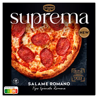 Suprema pizza salame romano is belegd met romige mozzarella en royale plakjes salami volgens Spianata Romana-stijl, zoals deze geliefd is in Italië. Het deeg doorloopt een speciaal 3-fasen fermentatieproces van 24 uur volgens de hoogste pizzastandaarden. Dat geeft deze pizza een superieure smaak – luchtig van binnen en heerlijk krokant van buiten.