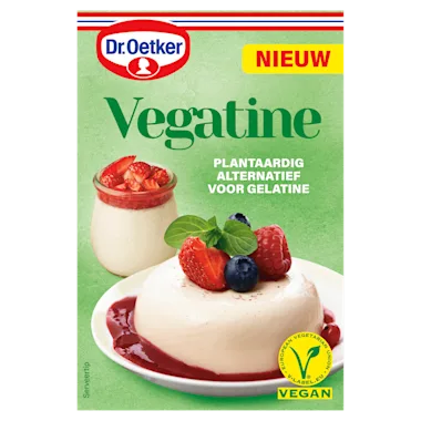 Met Dr. Oetker Vegatine geleer je gemakkelijk onder andere je taartjes, chocolademousse, panna cotta en pudding op een plantaardige basis. Perfect vegan alternatief voor dierlijke gelatine.