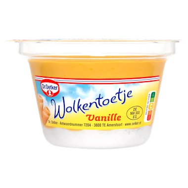 Ingrediënten: halfvolle MELK, 16% ROOM, suiker, gemodificeerd zetmeel (maïs) , invertsuikerstroop, geheel gehard kokosvet, maïszetmeel, gelatine, MELKEIWITTEN, emulgatoren (E 471 (bevat MELK), E 472b), verdikkingsmiddelen (carrageen, guarpitmeel), natuurlijk Bourbon-vanille-aroma, zout, kleurstof (carotenen), stabilisatoren (natriumfosfaten, natriumcarbonaten).