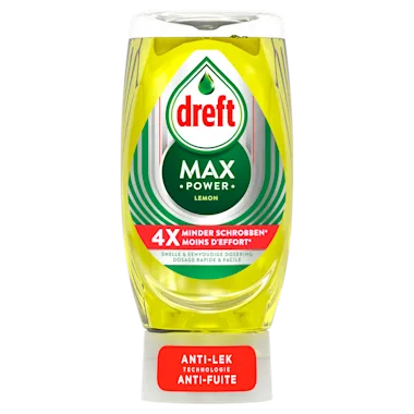 Dreft Max Power Lemon vloeibaar afwasmiddel wordt geleverd in een ondersteboven fles zonder flipdop, zodat je kunt schoonmaken zonder gedoe. Het maakt de afwas snel en eenvoudig, zodat je sneller klaar bent in de keuken.