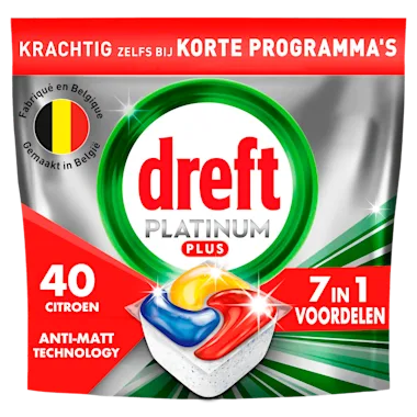 Dreft Platinum Plus All in One Anti-dofheidstechnologie vaatwastabletten zorgen voor een reiniging als nieuw, het geeft je Dreft's beste collectie voor het reinigen van hardnekkig voedsel en het helpt zelfs de dofheid weg te nemen die in de loop van de tijd is opgebouwd, om de oorspronkelijke glans van je vaatwerk te herstellen. Dreft Platinum Plus geeft je een uitmuntende reiniging en verwijdert hardnekkige voedselvlekken, zelfs in de testconditie van een korte cyclus. Dus, als je weinig tijd hebt, is er niets aan de hand. Schakel over op kort. Dreft combineert vloeistof en poeder in één krachtige capsule. Het ultra-oplosbare zakje lost snel op en werkt goed in korte cycli omdat het snel begint te reinigen om de klus klaar te krijgen. En ze zijn gemakkelijk te gebruiken. Plaats ze gewoon in het doseerbakje van je vaatwasser, met verpakking. Schakel over op de korte cyclus* en bespaar tijd, energie en water in vergelijking met een gewone, standaard cyclus!