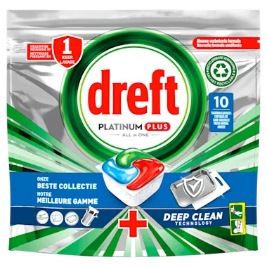 Dreft Platinum Plus All In One Vaatwastabletten bieden je een uitzonderlijk schone vaat in slechts korte tijd. Dreft Platinum Plus geeft je een uitmuntende reiniging en verwijdert hardnekkige voedselvlekken, zelfs in de testconditie van een korte cyclus. Dus als je weinig tijd hebt, dan is dat geen enkel probleem. Stap over op kort. Dreft combineert vloeistof en poeder in één krachtige tablet. Het ultra-oplosbare zakje lost snel op en werkt goed in korte cycli omdat het snel begint te reinigen om de klus klaar te krijgen. En ze zijn gemakkelijk te gebruiken. Plaats ze gewoon in het doseerbakje van je vaatwasser, met verpakking. Schakel over op de korte cyclus en bespaar tijd, energie en water in vergelijking met een gewone, standaard cyclus.