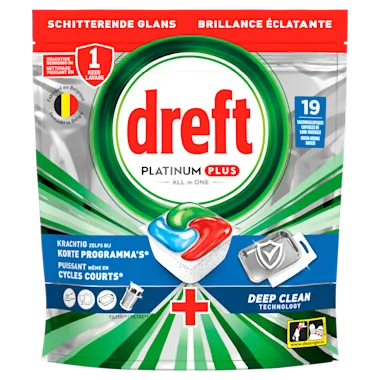 Dreft Platinum Plus All In One Deep Clean Vaatwastabletten bieden je een uitzonderlijk schone vaat in slechts korte tijd. Dreft Platinum Plus geeft je een uitmuntende reiniging en verwijdert hardnekkige voedselvlekken, zelfs in de testconditie van een korte cyclus. Dus als je weinig tijd hebt, dan is dat geen enkel probleem. Stap over op kort. Dreft combineert vloeistof en poeder in één krachtige tablet. Het ultra-oplosbare zakje lost snel op en werkt goed in korte cycli omdat het snel begint te reinigen om de klus klaar te krijgen. En ze zijn gemakkelijk te gebruiken. Plaats ze gewoon in het doseerbakje van je vaatwasser, met verpakking. Schakel over op de korte cyclus en bespaar tijd, energie en water in vergelijking met een gewone, standaard cyclus.
