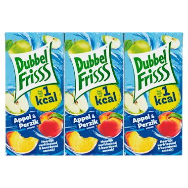 Vruchtenfrisdrank met appel- en perziksmaak. Gezoet met zoetstof, kort verhit