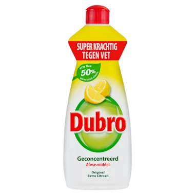 Dubro Afwasmiddel Original Extra Citroen is super krachtig tegen vet en zorgt voor een stralend resultaat. Met de vertrouwde, frisse citroengeur. De verpakking is gemaakt van 50% gerecycled plastic.
