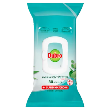 Dubro Hygiëne Ontvetter Doekjes reinigen en ontvetten grondig en zijn o.a. geschikt voor het schoonmaken van keukenoppervlakken zoals het werkblad en apparaten, tafel, stoelen, prullenbak, deurklink, fornuis, bad, wastafels, douchewanden, kranen en toiletbrillen. Dubro Hygiëne Ontvetter Doekjes laten geen sporen na en hebben een heerlijke en unieke eucalyptusgeur. De doekjes bevatten geen plastic. De monomateriaal verpakking is volledig recyclebaar en bevat minder plastic.