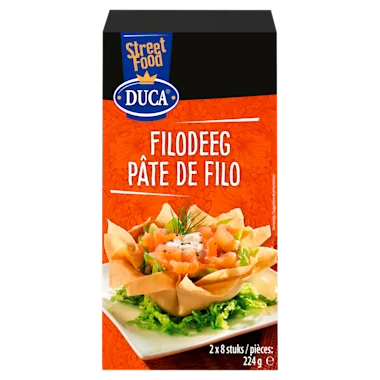 Ontdooi het filodeeg in de folie ca. 30 minuten bij kamertemperatuur.