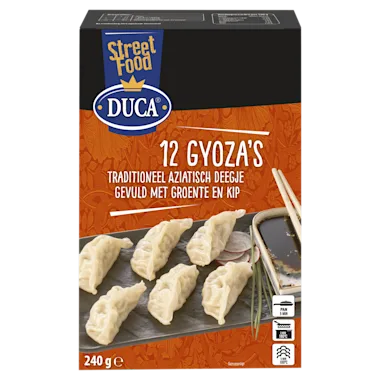 Gyoza: Deegje gevuld met groente en kip, diepvries.