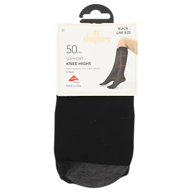 | duparc-kniekous-support-zwart-50-denier-2-paar | Als je een hele dag moet staan of zitten voor je werk, kun je aan het einde van de werkdag vermoeide benen hebben. Deze duParc Support kniekousen hebben een ondersteunend effect, dat een bijdrage levert aan een goede bloedsomloop, zelfs als je veel staat. Dit effect wordt veroorzaakt door het speciale Lycra Energize garen, dat niet alleen extra steun biedt bij vermoeide benen, maar ook heerlijk elastisch is. Hierdoor sluit de kniekous mooi aan op het been en blijft deze goed zitten.De kniekousen van duParc zitten altijd heerlijk. Ze worden namelijk gemaakt van hoogwaardige materialen met een perfecte afwerking. Zo heeft deze Support kniekous een breed en comfortabel boord, waardoor de kous goed op zijn plek blijft zitten, zonder te knellen. Je hoeft ook niet bang te zijn dat de kniekous afzakt. In de kous zit lycra verwerkt, waardoor de kous perfect aansluit op je benen. Dankzij het versterkte teenstuk geniet je ook nog eens extra lang van deze premium kniekous. De kniekousen van duParc geven iedere vrouw een prachtige uitstraling! | Geef jouw benen wat extra steun met de duParc Kniekous Support! Deze semi-opaque, zwarte kniekousen van 50 denier hebben een ondersteunend effect. De kniekous heeft een versterkt teenstuk en een breed jacquard boord voor ultiem draagcomfort. |
