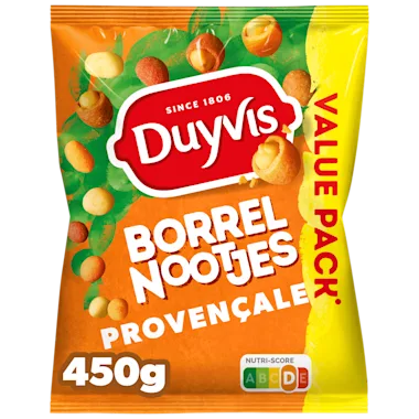 Duyvis Borrelnootjes® Provencale zijn heerlijke pinda’s met een knapperig jasje in een ui- en knoflooksmaak. Deze nootjes zijn gemaakt om de fuif te brengen! Haal dus snel jouw welbekende favoriet in huis. Zonder kunstmatige kleurstoffen.