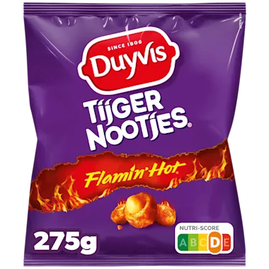 Duyvis Tijgernootjes/Tiger nuts Flamin' Hot, combineert de crunchy Tijgernootjes waar je van houdt met de heerlijk pittige smaak van Flamin' Hot! Elke knapperige hap prikkelt je smaakpapillen met een smaaksensatie waar je geen genoeg van kunt krijgen