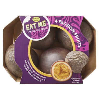 De passievrucht - of passiefruit - is hard op weg om het exotische imago kwijt te raken. Je ziet ze steeds vaker in het Europese fruitschap. Exotisch van herkomst blijven de vruchten wel. In landen als Brazilië, Zimbabwe, Thailand en Vietnam groeien ze aan klimplanten, planten uit de familie waar de vrucht haar naam aan te danken heeft: de passieflora. Het zachtgele vruchtvlees zit boordevol met pitjes die je gewoon kunt eten. Die pitjes smaken friszuur. Als de donkerpaarse schil rimpelig wordt, is de vrucht lekker. Let er dus goed op bij het kopen van passievruchten, dat de schil in de winkel glad maar zeker niet rimpelig oogt. Dan voelt de vrucht ook een beetje ‘zwaar’ aan. De schil zelf - die leerachtig en hard is - kun je niet eten.