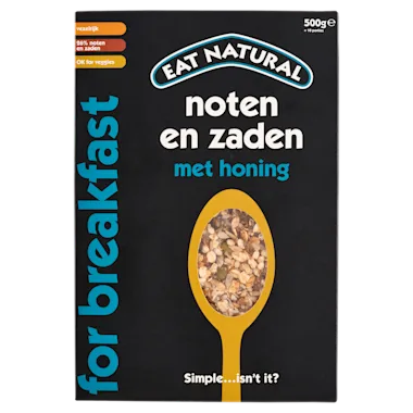 Dit pak bevat geroosterde muesli met een mix van noten en zaden en... ook nog honing.