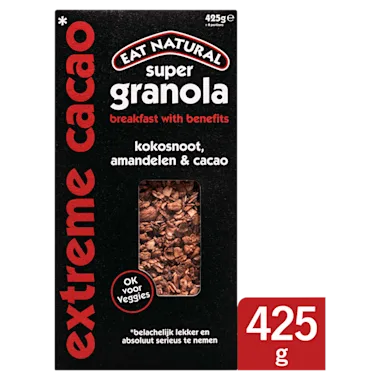 Eat Natural Super Granola is speciaal gemaakt om jou een overheerlijke droomstart van de dag te bezorgen. We gebruiken alleen de beste voedzame ingrediënten en een beetje van onze Eat Natural-knowhow. Zo is het ons‚ denken we‚ gelukt om een granola te maken die best wel bijzonder is. Volgens ons is het namelijk niet alleen de lekkerste die je kunt krijgen‚ maar we doen er nog een schepje bovenop… ‘breakfast with benefits’ noemen we dat. Je zult versteld staan van de heerlijke smaak. Want de ingrediënten worden in onze Makery voorzichtig met de hand gemixt en vervolgens wel twee keer geroosterd voor extra krokantheid. En… er is nog meer te ontdekken. In dit unieke recept van slechts acht onweerstaanbare ingrediënten is‚ behalve amandelen en kokosnoot‚ ook een schep volle‚ pure Belgische cacaopoeder toegevoegd. Dat klinkt misschien extreem‚ maar we weten nu al dat jij het super lekker gaat vinden! Simple…isn’t it?