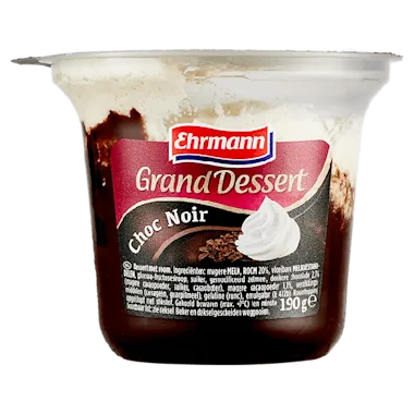 Ingrediënten: magere MELK, ROOM 20%, vloeibare MELKBESTANDDELEN, glucose-fructosesiroop, suiker, gemodificeerd zetmeel, donkere chocolade 2,7% (magere cacaopoeder, suiker, cacaoboter), magere cacaopoeder 1,1%, verdikkings-middelen (carrageen, guarpitmeel), gelatine (rund), emulgator (E 472b). Roomtopping opgeklopt met stikstof.