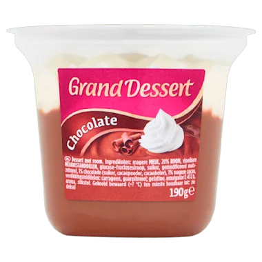 Ingrediënten: magere MELK, 20 % ROOM, vloeibare MELKBESTANDDELEN, glucose-fructosesiroop, suiker,gemodificeerd maïszetmeel, 1 % chocolade (suiker, cacaopoeder, cacaoboter), 1 % magere cacao,verdikkingsmiddelen: carrageen, guarpitmeel; gelatine, emulgator E 472 b, aroma, stikstof.Voedingswaarden per 100 g: Energie/Vetten/waarvan verzadigde vetzuren/Koolhydraten/waarvansuikers/Eiwitten/ Zout.
