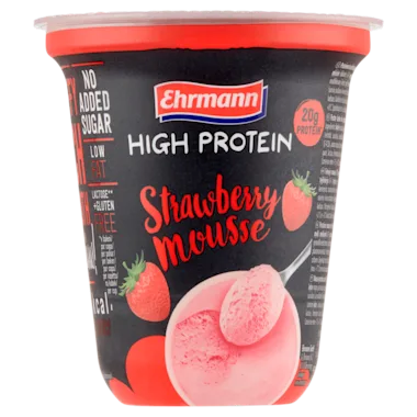 Ehrmann High Protein Fruchtmousse mit 20g Protein pro Genuss-Großbecher. Schmeckt auch ohne Zuckerzusatz, hat wenig Fett und ist Laktose- sowie Glutenfrei. Luftiges Fruchtmousse mit fruchtigem Erdbeergeschmack.