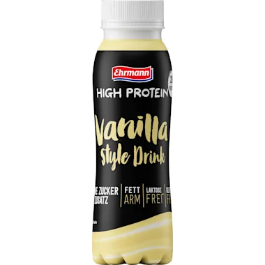 Mit dem Ehrmann High Protein Drink in der Geschmacksrichtung Vanilla Style gibt’s dank 20g Protein pro Flasche Schluck für Schluck die volle Ladung Power und Genuss. Super leckerer Vanille-Geschmack – ganz ohne Zuckerzusatz, Laktose und Gluten bei wenig Fett.